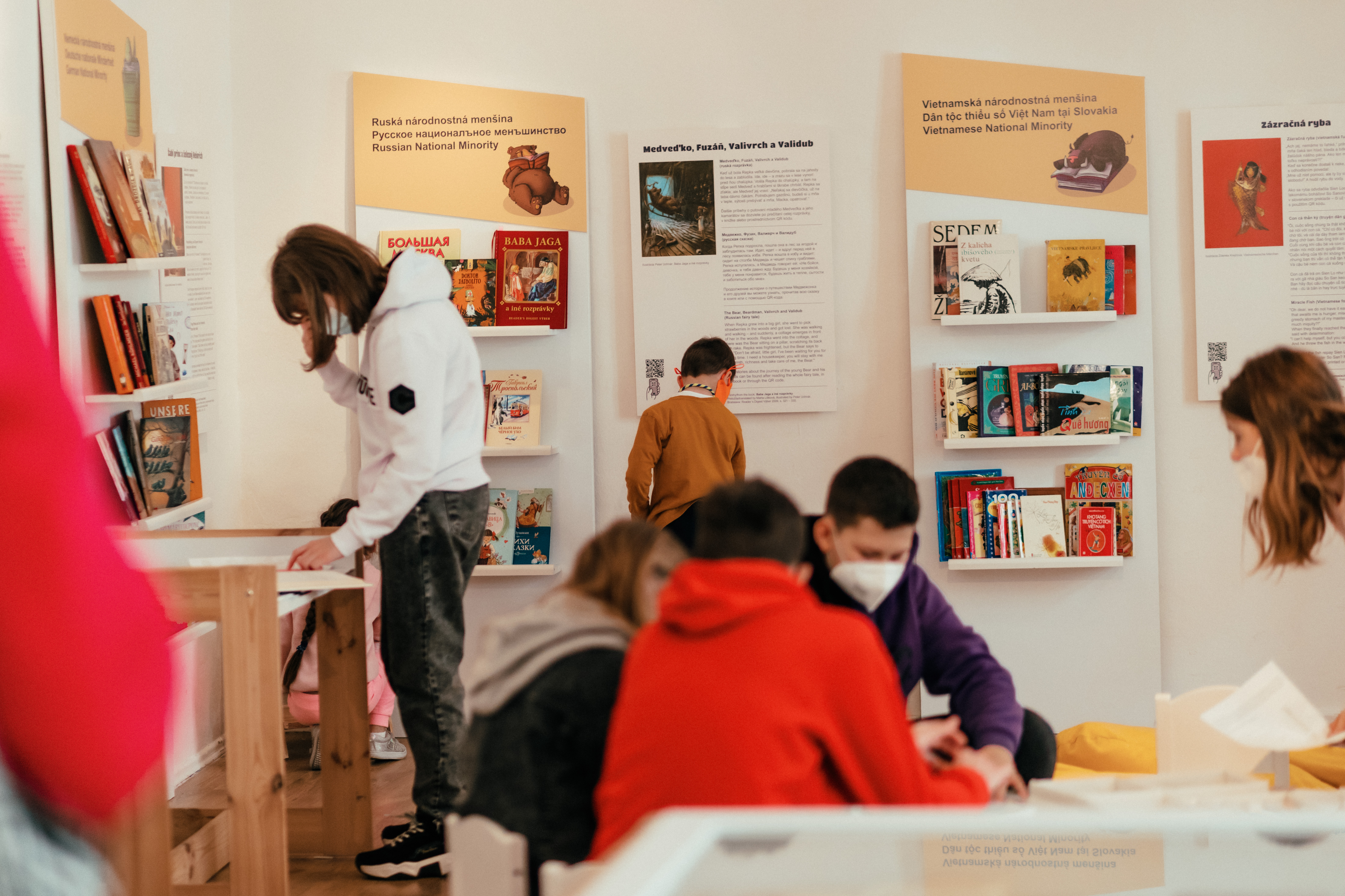 Na výstave nájdete obrázkové knižky, povesti, knihy pre mládež, rozprávky či leporelá. A hoci sú písané v rozličných jazykoch, majú veľa spoločného. V každej rozprávke spravodlivosť vždy víťazí, zlo býva potrestané, pravda sa nakoniec ukáže a dobrých sa všade veľa zmestí. Ako do deduškovej stratenej rukavice, do ktorej sa postupne nasťahovali rôzne zvieratká... Malá myš, žabka, zajac, diviak, vlk, líška a vošiel sa aj veľký medveď. Vždy sa nejako potisli a urobili miesto pre ďalšieho príchodzieho. Nech je výstava #slovo#jazyk#kniha symbolickou rukavičkou, v ktorej všetci spolu dobre nažívame.