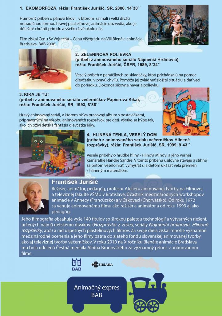 Deti zo základných škôl na Ďumbierskej 17, na Skuteckého a na Bakošovej ulici videli dve kolekcie animovaných filmov, v ktorých našli hviezdne večerníčky Františka Jurišiča, ocenené na mnohých medzinárodných festivaloch. Videli aj filmy pre deti Vandy Raýmanovej, výtvarníčky, režisérky a pedagogičky Ateliéru animovanej tvorby na VŠMU, ktoré získali ceny na festivale BAB. Deti spontánne reagovali na situácie z premietaných filmov, kládli zvedavé otázky o ich tvorbe a realizácii, zaujímali sa o technológiu výroby bábkového a papierikového filmu. Potvrdili, že pozitívny vplyv tvorby Večerníčkov stále trvá, rovnako ako je nadčasový aj jeho etický a estetický odkaz.