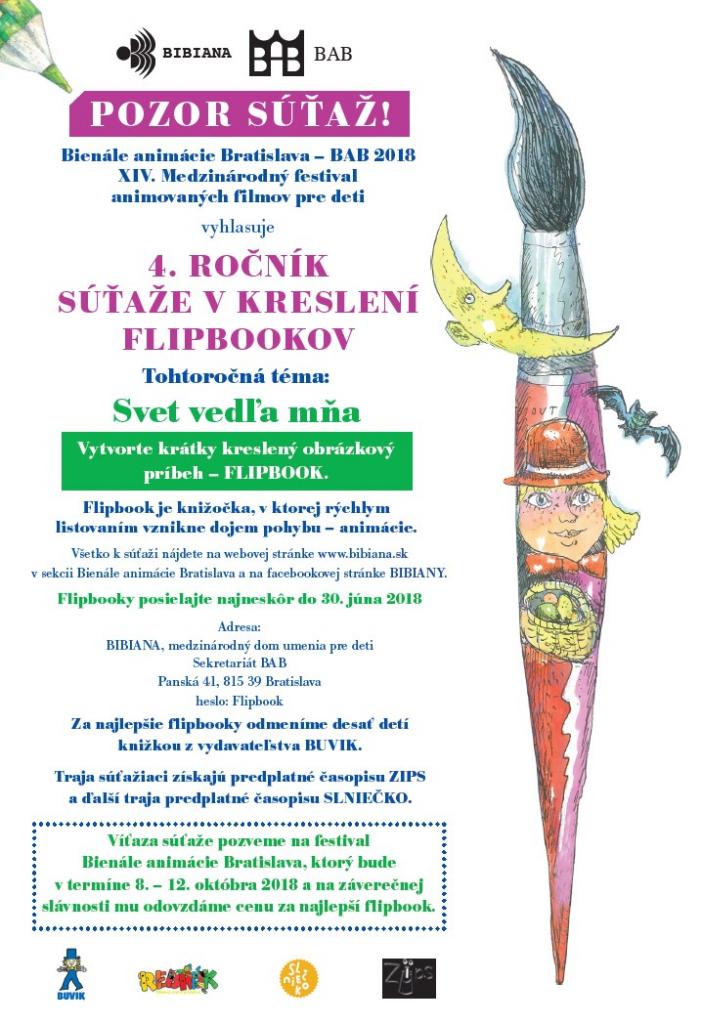 XIV. ročník Bienále animácie Bratislava - BAB 2018 pokračuje v tradícii vyhlásenia súťaže v tvorbe flipbookov. Aj tohtoročná téma Svet vedľa mňa má za cieľ aktívne zapojiť do festivalového diania deti z celého Slovenska, dať im možnosť formou zábavy rozvinúť tvorivosť a objaviť tajomstvo animácie. Objavovanie jednoduchého pohybu, ktorý je počiatkom vzniku animácie, je nielen inšpiratívne, ale predstavuje aj skvelé mediálne vzdelávanie.