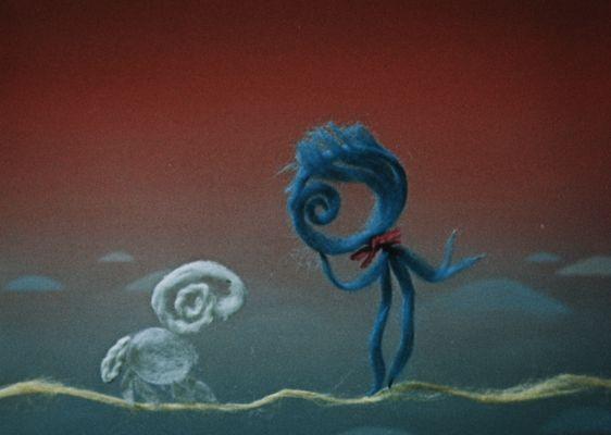 Príbeh o priateľstve bieleho baránka a chlapčeka, vytvorených z farebných vlnených vlákien.