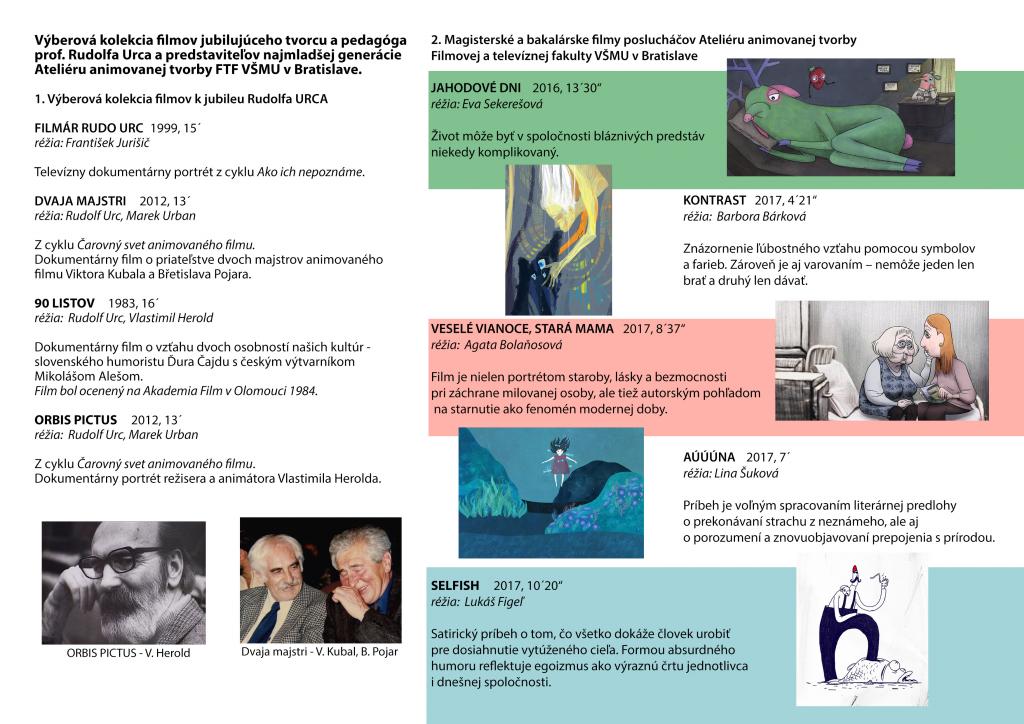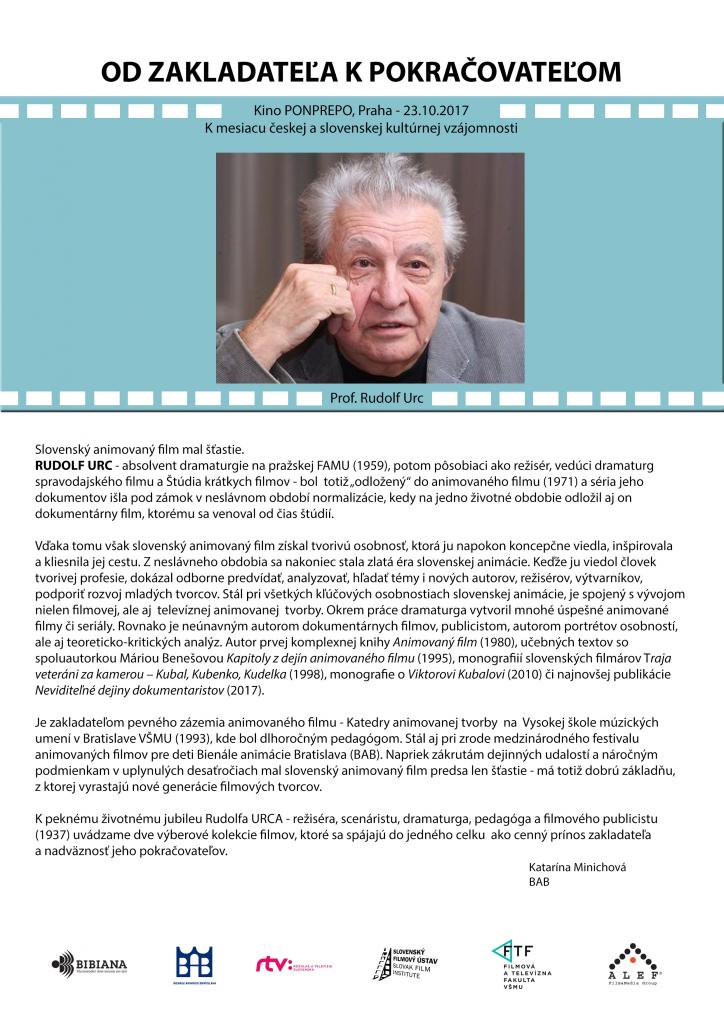 BAB uvádza k Mesiacu českej a slovenskej kultúrnej vzájomnosti výberovú kolekciu filmov jubilujúceho tvorcu a pedagóga prof. Rudolfa Urca a predstaviteľov najmladšej generácie Ateliéru animovanej tvorby Filmovej a televíznej fakulty VŠMU v Bratislave spojenú a účasťou tvorcov a diskusiou.