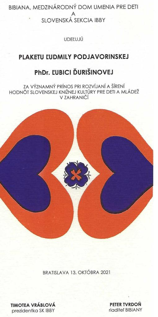 BIBIANA, medzinárodný dom umenia pre deti a Slovenská sekcia IBBY (International Board on Books for Young People) udelili 13. októbra na Bratislavskom hrade Plakety Ľudmily Podjavorinskej.